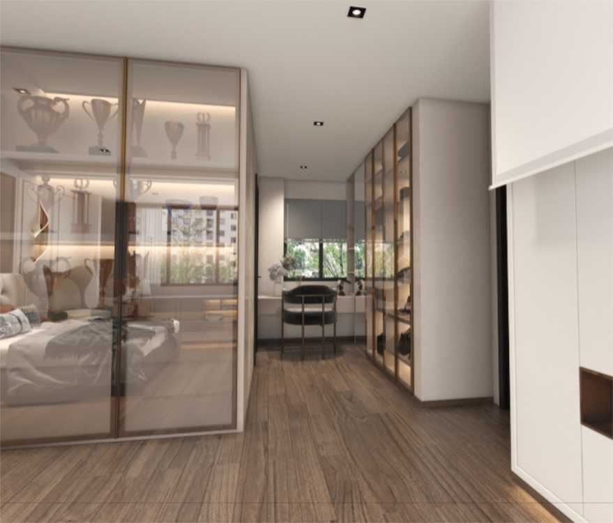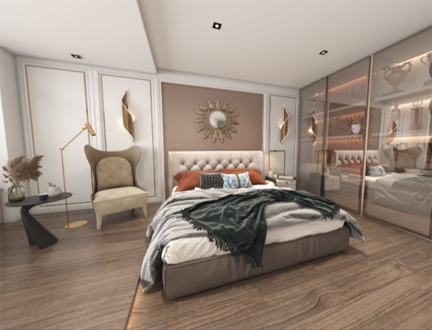 本項目是屬于精裝房局改,我們在原有的建筑結構上做了加建的調整,使空間更大氣。墻面用了護墻板加鏡面裝飾,是空間更靈動,護墻板加定制藝術墻面巖板,增加高貴的藝術氣息