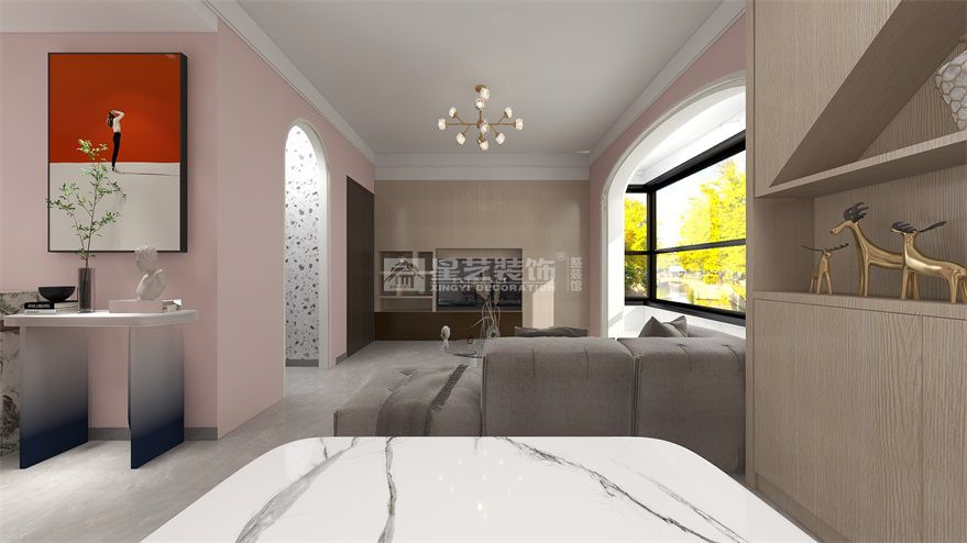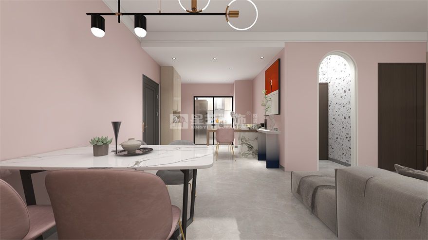 餐廳看上去通透明亮,四人的圓桌搭配淺粉色的墻面,恰到好處的擺件點(diǎn)綴增加添活力。