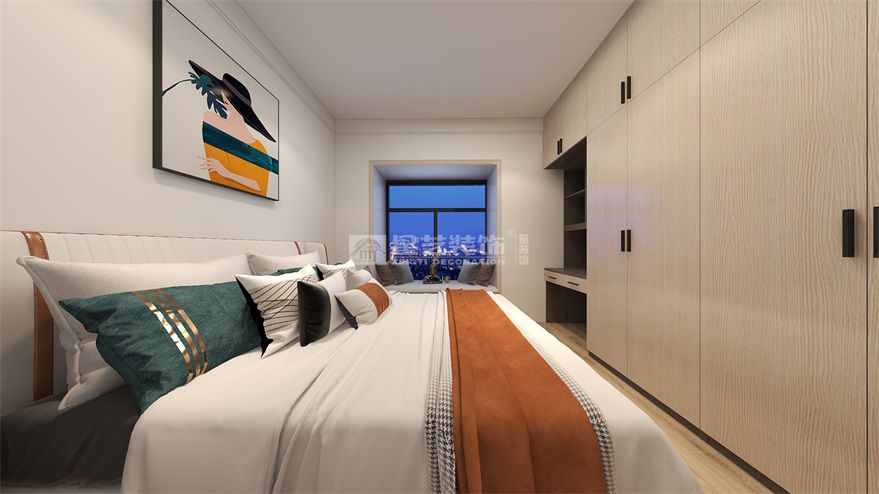 主臥簡(jiǎn)約治愈,整體風(fēng)格溫馨舒適。深綠色背景墻,延伸進(jìn)房間,定制衣柜與桌子相連接,既節(jié)省空間又能滿足日常的儲(chǔ)放功能。